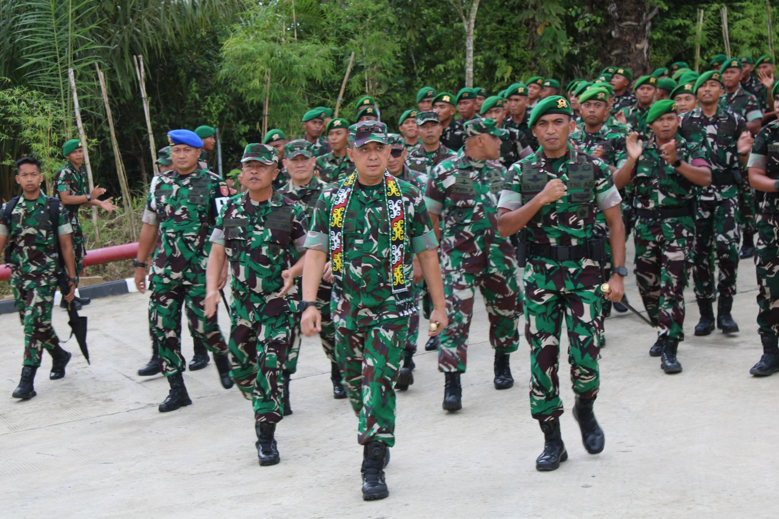 Pangdam VI/Mlw tiba di MA Yonif TP 826/BTB disambut dengan prajurit dengan membawa beberapa pejabat Kodam VI/Mlw yaitu Asisten Logistik Kasdam VI/Mlw Kolonel Inf M. Zulnalendra Utama dan Kepala Zeni Kodam VI/Mlw Kolonel Czi Alpi Fahrudin Nur, S. E.