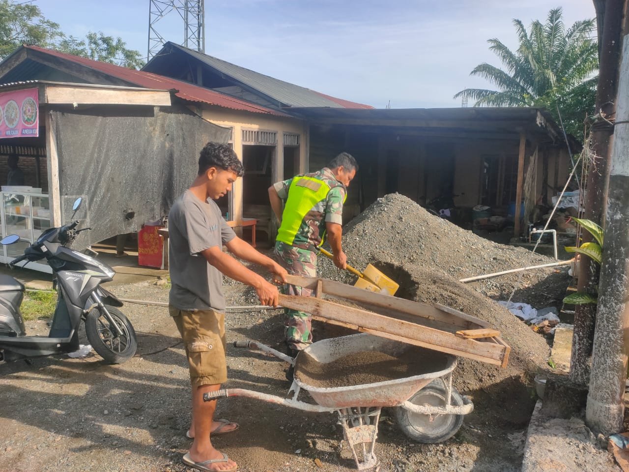 ACEH BARAT – Serka Saferi Pasaribu, seorang Bintara Pembina Desa (Babinsa) Koramil 03/Kaway XVI Kodim 0105/Aceh Barat, turut membantu warga Desa Alu Tampak, Kecamatan Kaway XVI, Kabupaten Aceh Barat, dalam pembangunan dapur rumah salah seorang warga, Jumat (21/11/2025).