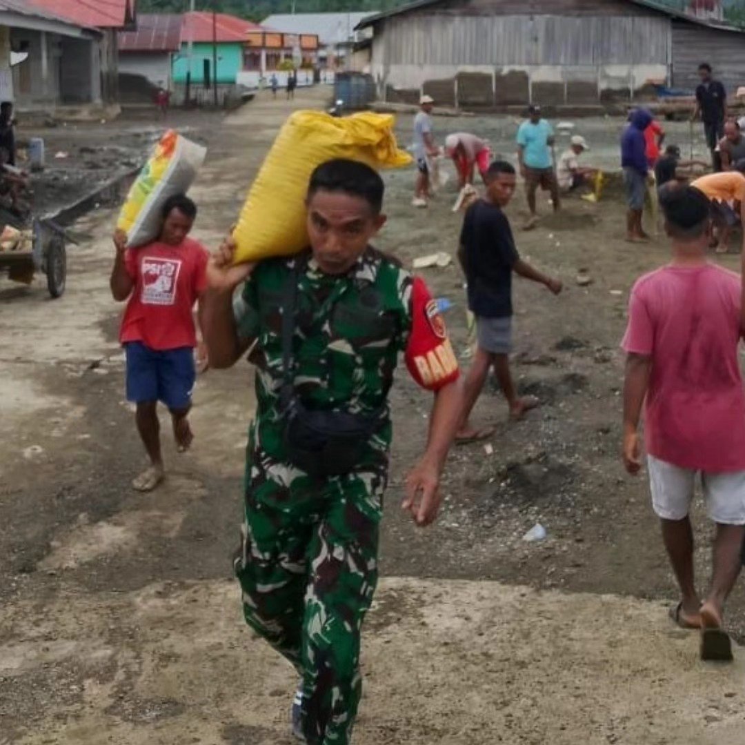 Kegiatan ini dilakukan sebagai bentuk sinergi antara TNI dan masyarakat dalam mendukung pembangunan sarana keagamaan. Tampak Babinsa dan warga bahu-membahu memindahkan material bangunan secara manual ke lokasi masjid yang akan direnovasi.