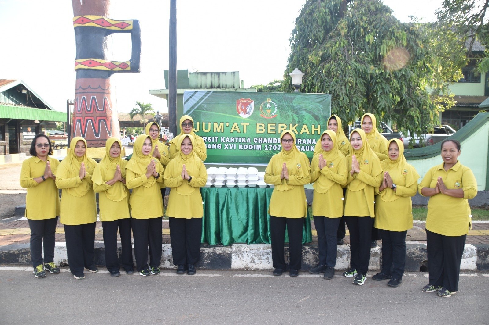 Kegiatan Jumat Berkah tersebut dipimpin langsung oleh Ketua Persit Kartika Chandra Kirana Cabang XVI Kodim 1707/Merauke, Ny. Asti Dili Eko Setyawan, didampingi para pengurus Persit. Dalam kegiatan ini, Persit Kartika Chandra Kirana Cabang XVI Kodim 1707/Merauke membagikan sedikitnya 100 paket makanan berupa nasi kuning kepada para pengguna jalan yang melintas di depan Makodim 1707/Merauke.