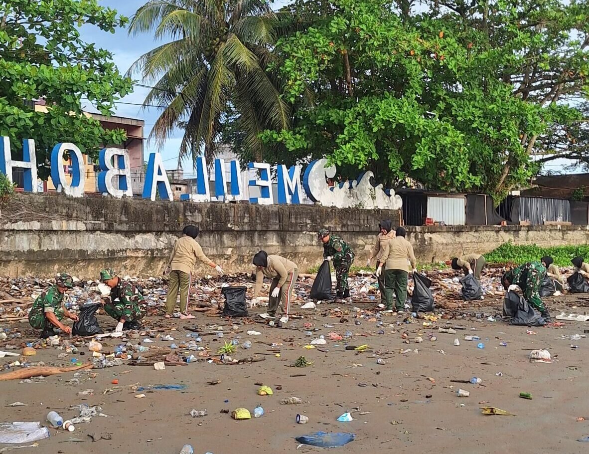 Meulaboh – Wujud kepedulian terhadap kebersihan lingkungan dan kesehatan masyarakat, personel Detasemen Kesehatan Wilayah (Denkesyah) Meulaboh melaksanakan kegiatan pembersihan di kawasan Pantai Pasar Baru Ujung Karang, Meulaboh, Kabupaten Aceh Barat.