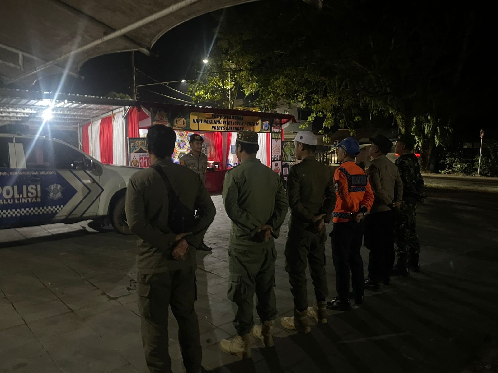 Jumlah personel yang bertugas di posko sebanyak 9 orang, terdiri dari 2 personel TNI, 3 personel Polri, 1 personel Dinas Perhubungan, dan 3 personel Satpol PP. Apel kesiapan personel dipimpin oleh Brigadir Rizky sebelum pelaksanaan tugas pengamanan di lapangan.