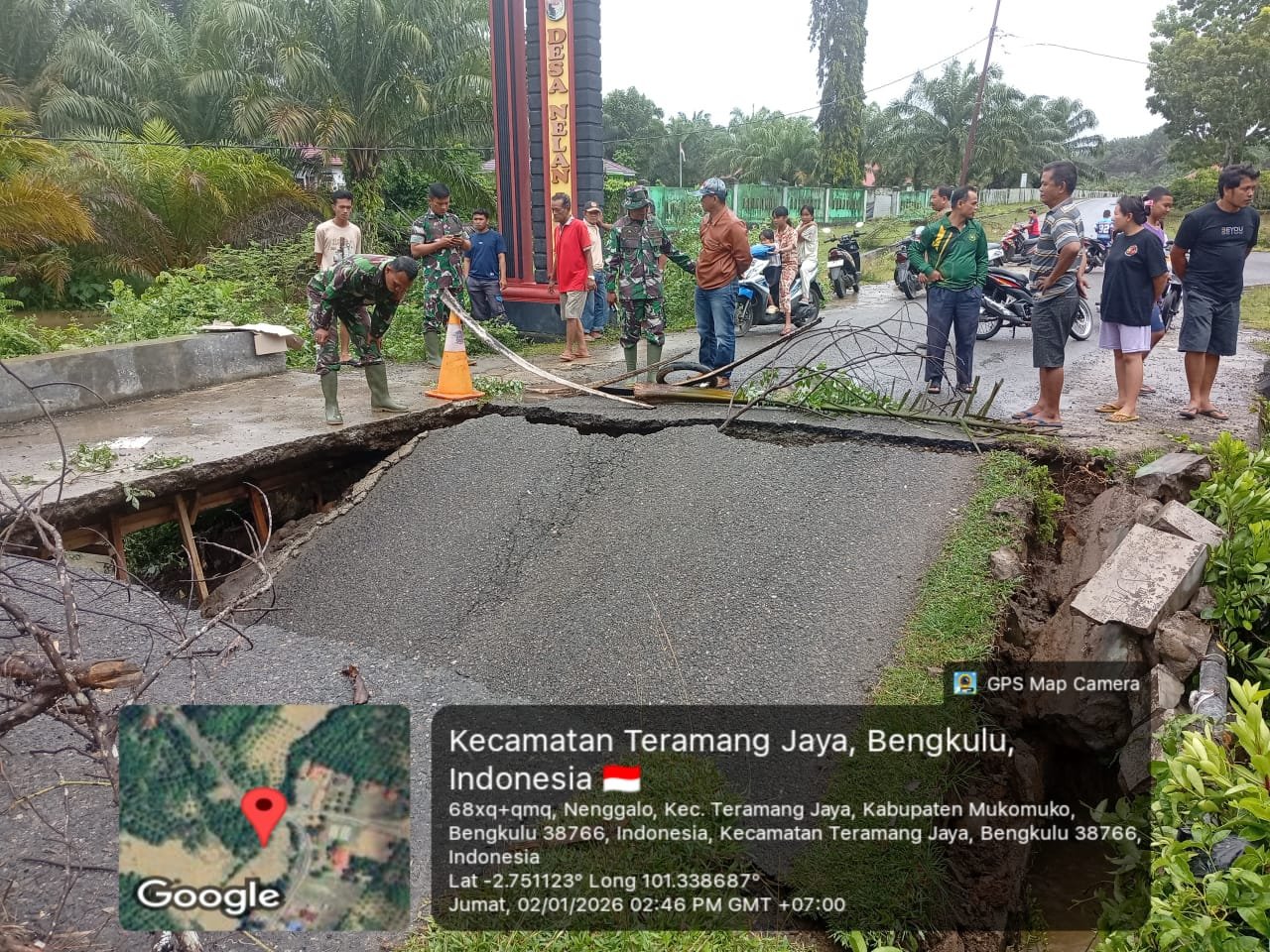 Menindaklanjuti kejadian tersebut, personel Kodim 0428/MukoMuko turun langsung ke lokasi untuk melakukan peninjauan dan pengecekan kondisi jembatan yang rusak. Peristiwa ini terjadi di jalan poros Desa Pondok Baru Pasar Bantal, tepatnya di Jembatan Desa Nenggalo, Kecamatan Teramang Jaya, Kabupaten MukoMuko, pada Jumat (02/01/2026).