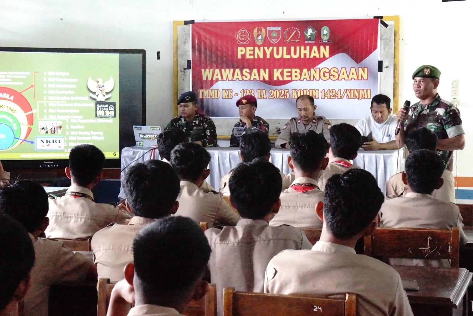 SINJAI. Dalam rangka meningkatkan pemahaman tentang wawasan kebangsaan di kalangan generasi muda, Personel Satuan Tugas (Satgas) TNI Manunggal Membangun Desa (TMMD) Kodim 1424/Sinjai menggelar penyuluhan di SMA Negeri 4 Sinjai yang berlokasi di Kecamatan di Desa Lamatti Riaja, Kecamatan Bulupoddo, Kabupaten Sinjai. Jumat (21/02/2025).