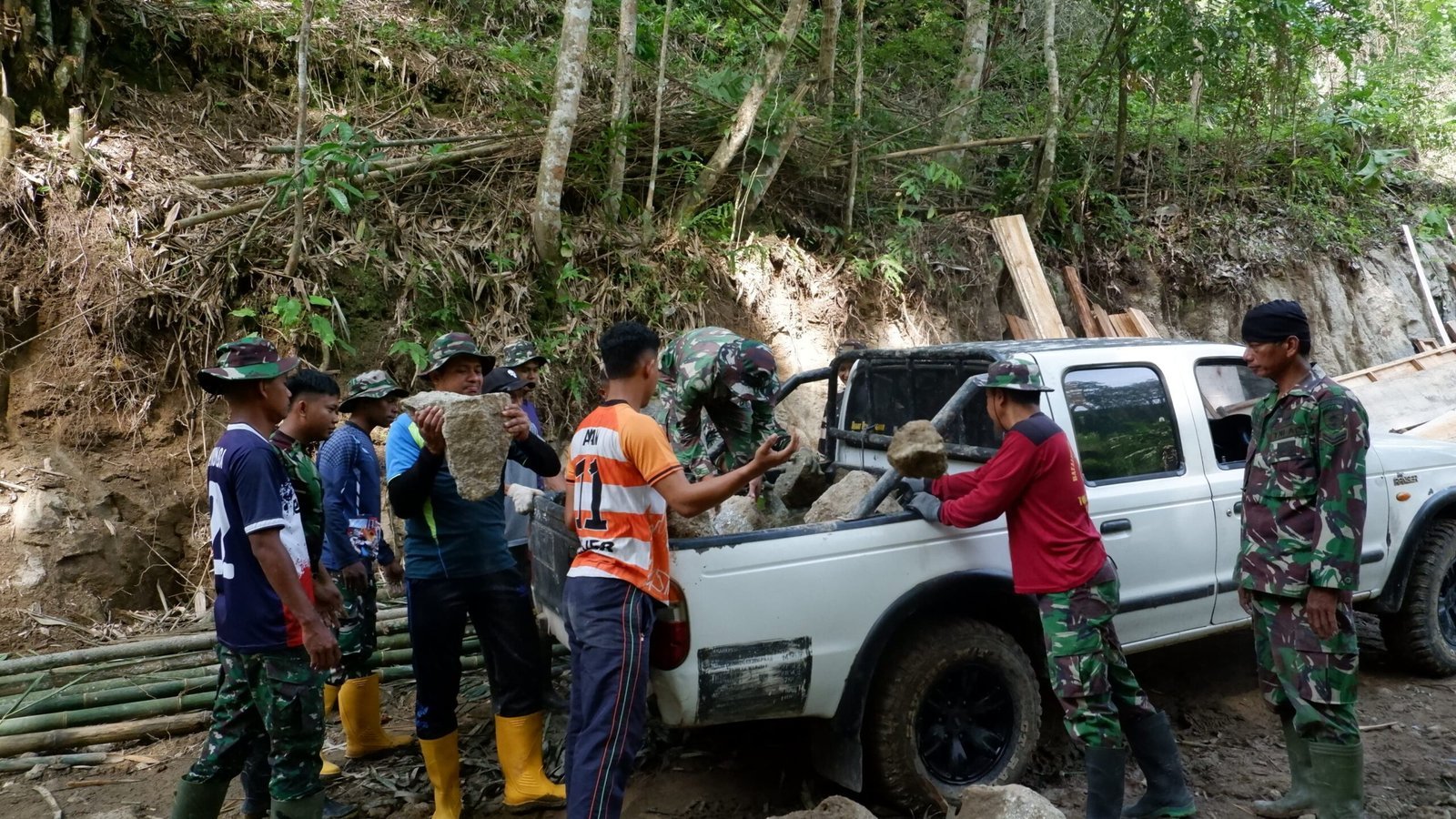 Di bawah koordinasi yang baik, para personel Satgas bahu-membahu mengangkat dan menyusun batu pondasi yang akan digunakan untuk melanjutkan pembangunan jembatan. Meskipun pekerjaan ini cukup berat, semangat pantang menyerah dan kebersamaan yang tinggi membuat prosesnya berjalan dengan lancar.