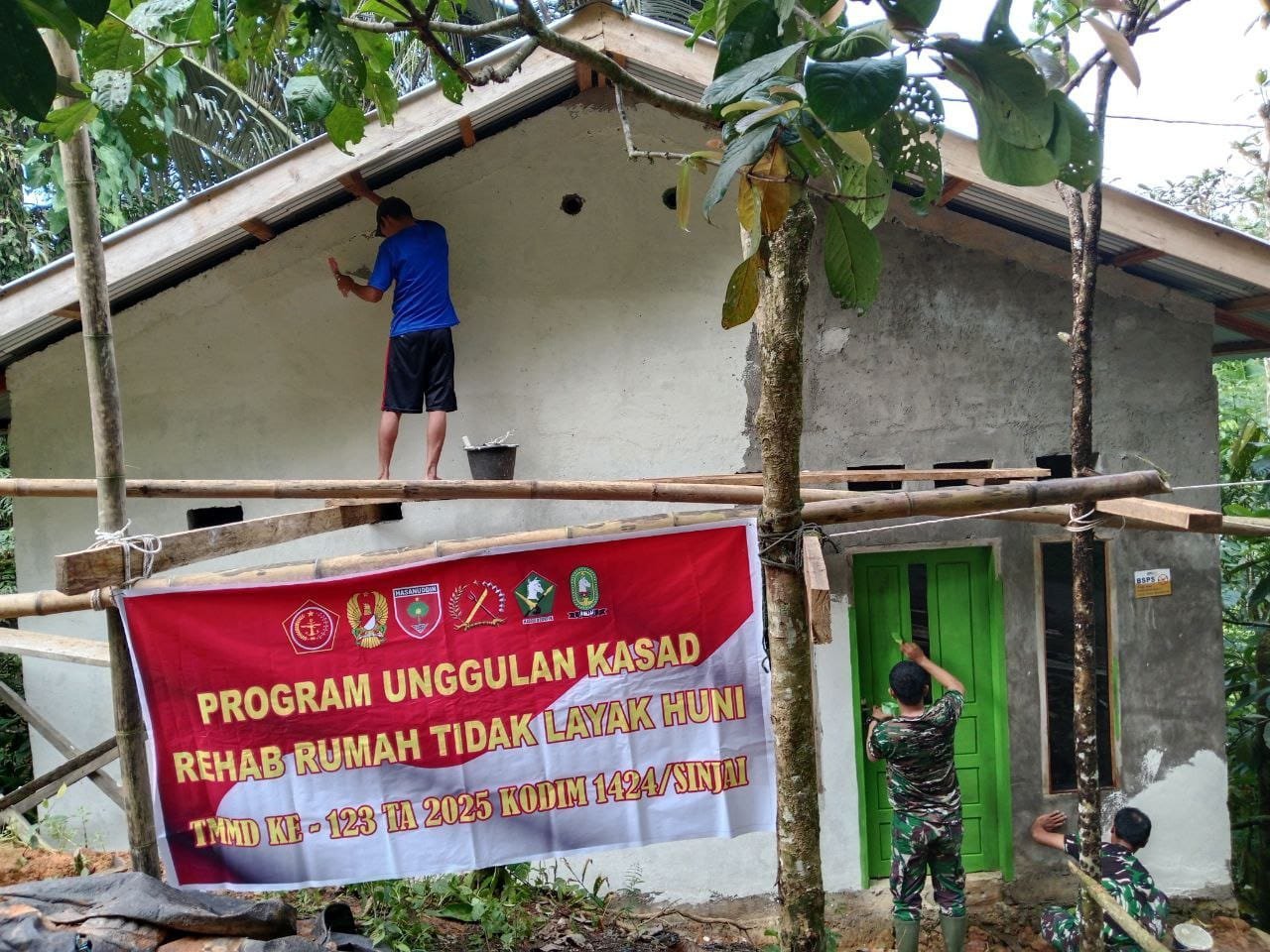 SINJAI. Personel Satuan Tugas (Satgas) TNI Manunggal Membangun Desa (TMMD) ke-123 Kodim 1424/Sinjai terus melanjutkan pembangunan Rumah Tidak Layak Huni (RTLH) di Desa Turungan Baji, Kecamatan Sinjai Barat, Kabupaten Sinjai. Kali ini, personel Satgas TMMD melakukan tahap pengecatan dinding luar rumah, sebagai bagian dari penyelesaian renovasi agar rumah lebih layak huni bagi warga penerima bantuan, Rabu (12/3/2025).