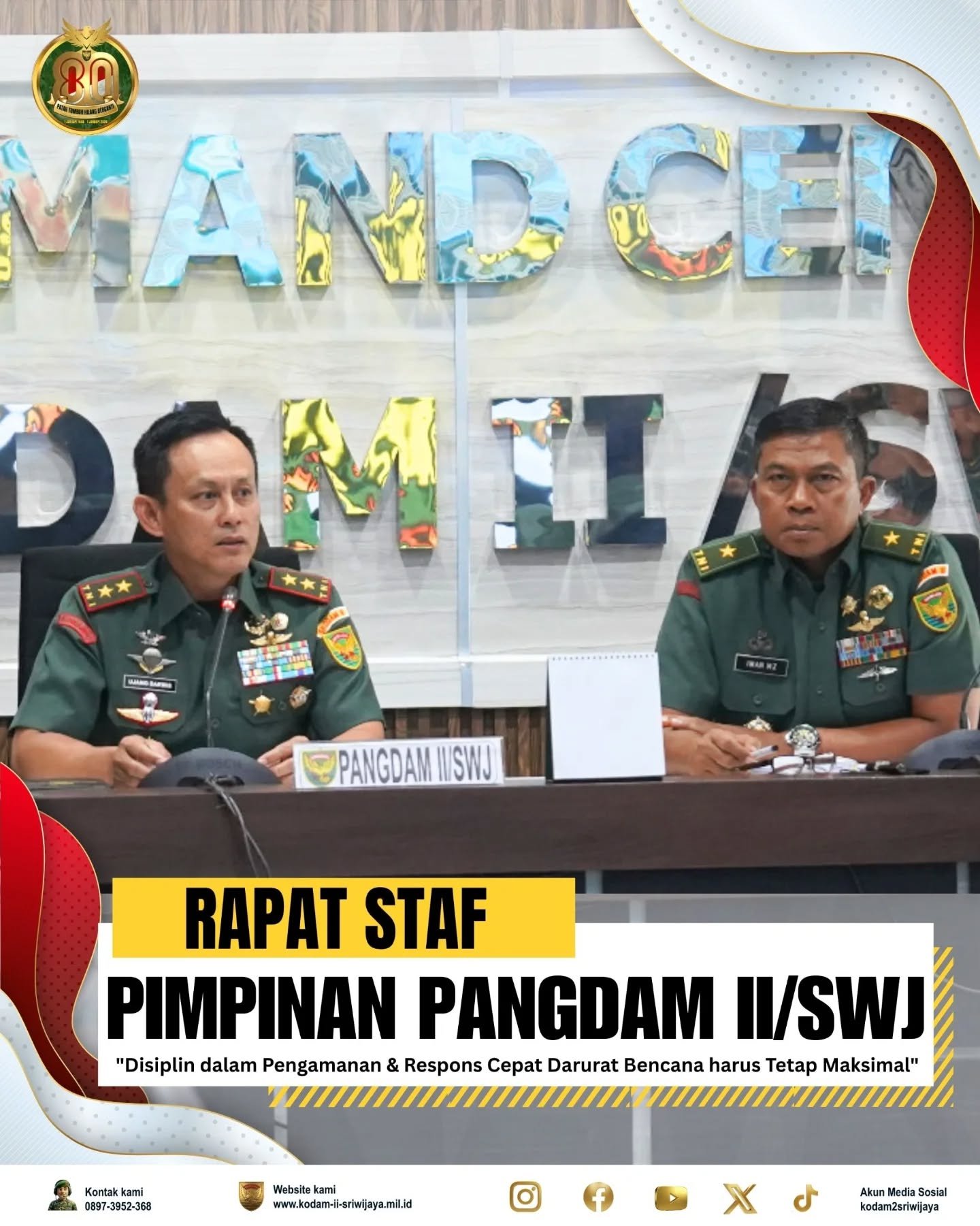 Pangdam II/Sriwijaya, dalam rapat ini menekankan pentingnya responsivitas seluruh jajaran dalam menghadapi dinamika lapangan yang terus berubah. Setiap personel diharapkan tidak hanya bekerja sesuai rutinitas, tetapi juga memiliki kepekaan terhadap isu-isu terkini, mulai dari masalah sosial, keamanan wilayah, hingga efektivitas patroli di titik-titik rawan.