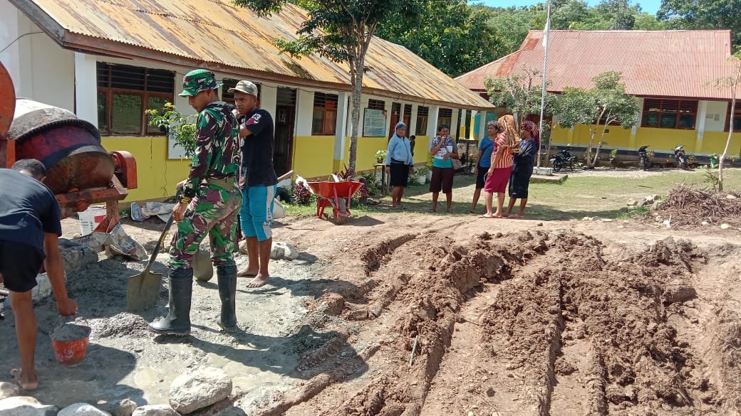 Babinsa Koramil setempat, Serka Lamberto Da Costa., turun langsung ke lokasi bersama warga. Bahu-membahu, mereka mengerjakan pondasi bangunan dengan penuh semangat dan kekompakan, meskipun berada di wilayah dengan kondisi geografis yang cukup menantang.