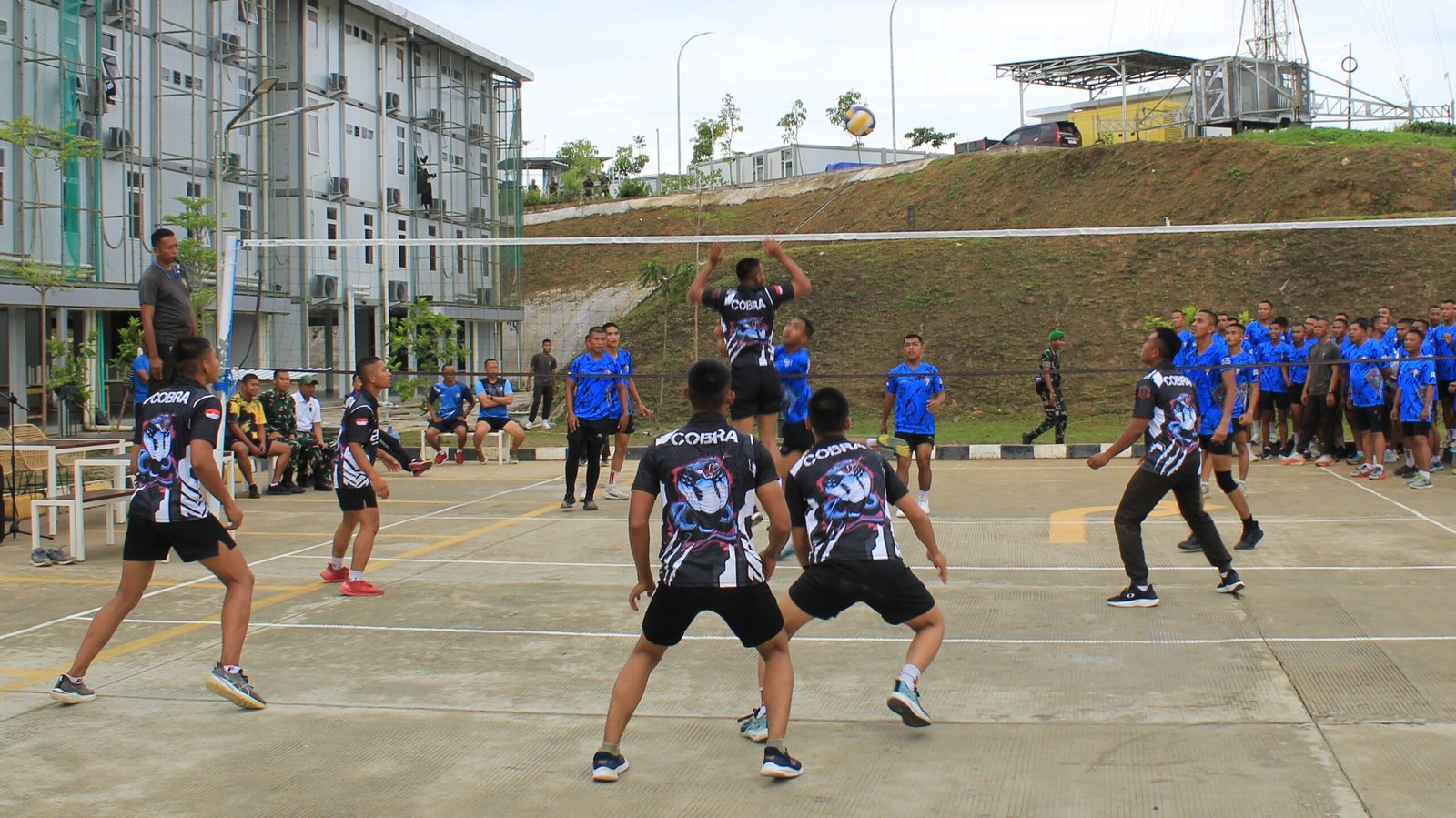 Sengit dari awal bertanding membuat tegang suasana lapangan voli batalyon, termasuk di luar lapangan pun mulai riuh semenjak peluit pertama di tiupkan wasit.
