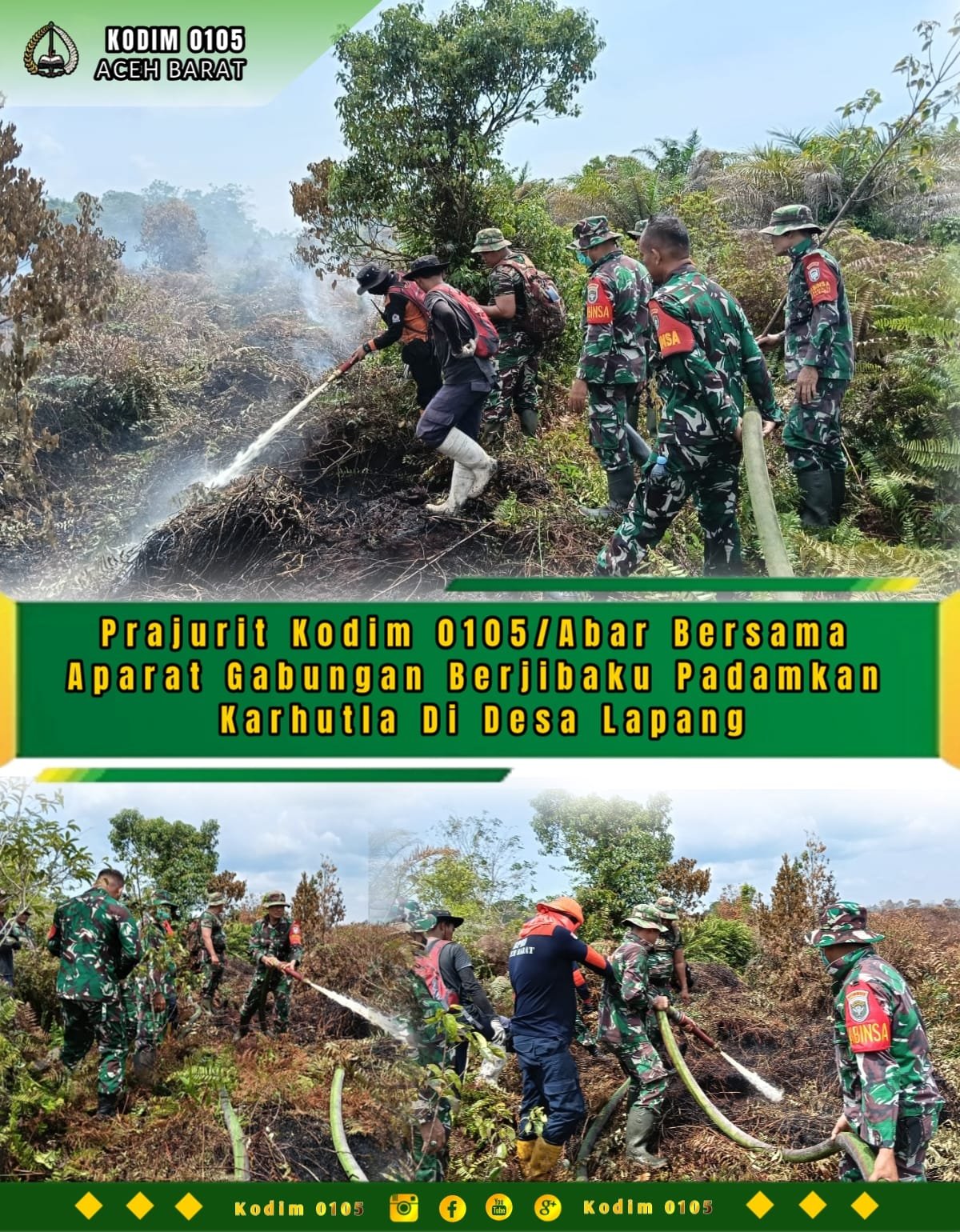 ACEH BARAT – Prajurit Kodim 0105/Abar bersama aparat gabungan dari BPBD dan relawan masyarakat berjibaku memadamkan kebakaran hutan dan lahan (karhutla) di lahan kosong yang berlokasi di Desa Lapang, Kecamatan Johan Pahlawan, Rabu (21/1/2026).