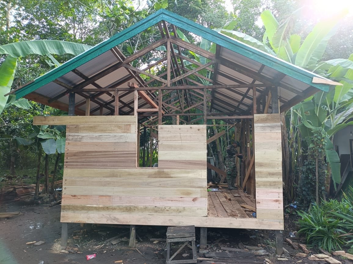Dengan penuh kedisiplinan, para prajurit bergantian menaiki rangka rumah untuk memasang kuda-kuda, kaso, reng, hingga seng, sementara kelompok lain menata papan kayu untuk dinding bagian luar, Jumat (31/10).