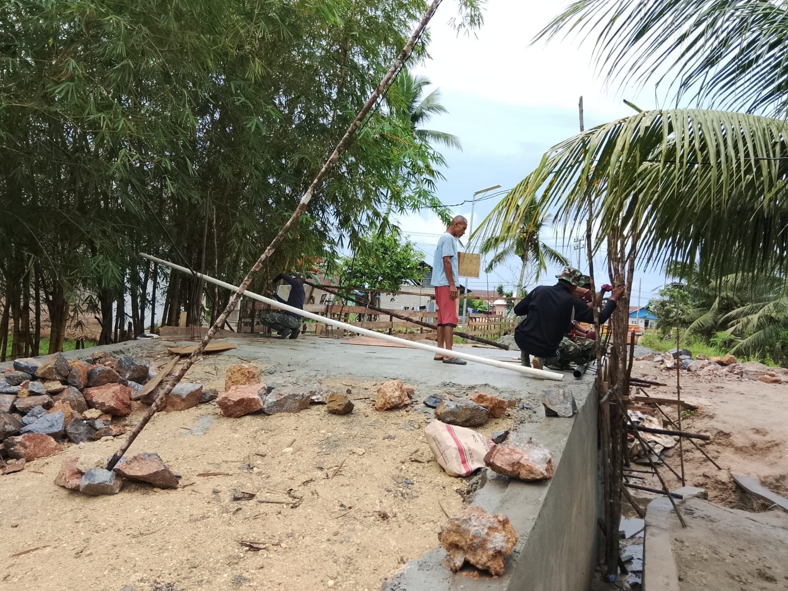 Pada tahapan terbaru, para prajurit terlihat merakit mal atau cetakan beton yang akan digunakan untuk pemasangan besi sandaran di sisi kiri dan kanan jembatan.