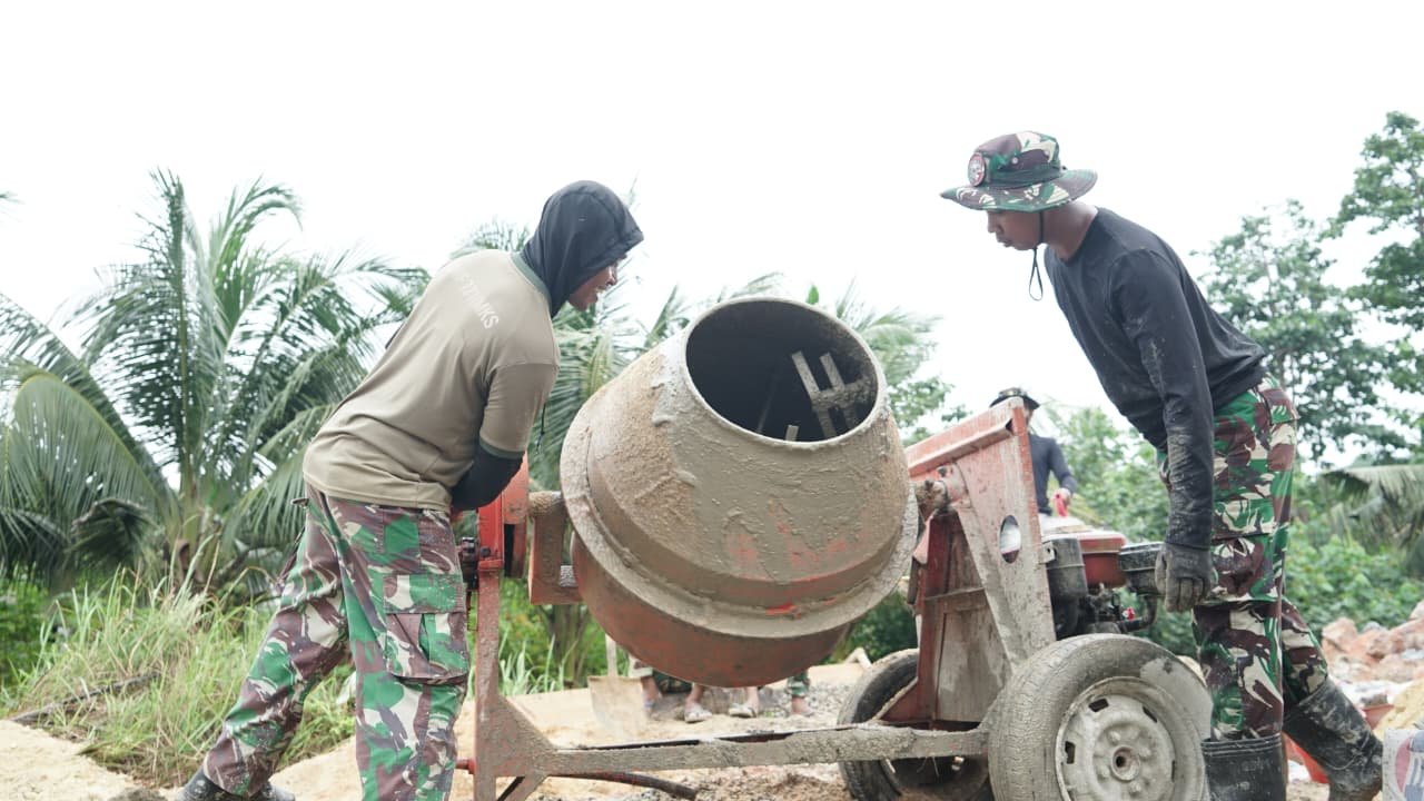 Salah satu prajurit, Pratu Wawan, terlihat terampil mengoperasikan mesin pencampur beton guna memastikan komposisi material sesuai standar konstruksi. Peran operator molen menjadi kunci penting dalam menjaga mutu pembangunan infrastruktur yang sedang dikerjakan.