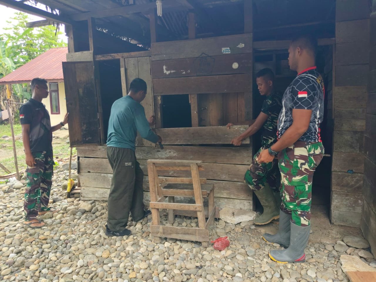 Dengan penuh semangat, anggota Satgas melakukan pembongkaran material lama dan menggantinya dengan bahan yang lebih kokoh. Langkah ini bertujuan agar rumah yang direhabilitasi memiliki struktur yang lebih kuat dan layak ditempati.