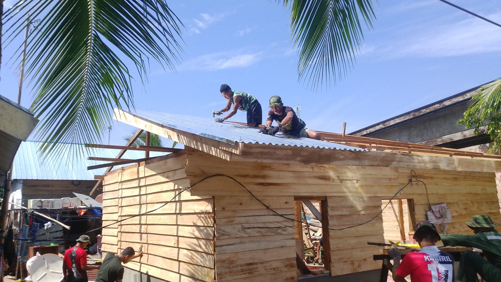 Dalam tahap terbaru pembangunan, personel Satgas TMMD bersama masyarakat melakukan pemasangan material atap baru sebagai bagian dari proses penyelesaian renovasi rumah.