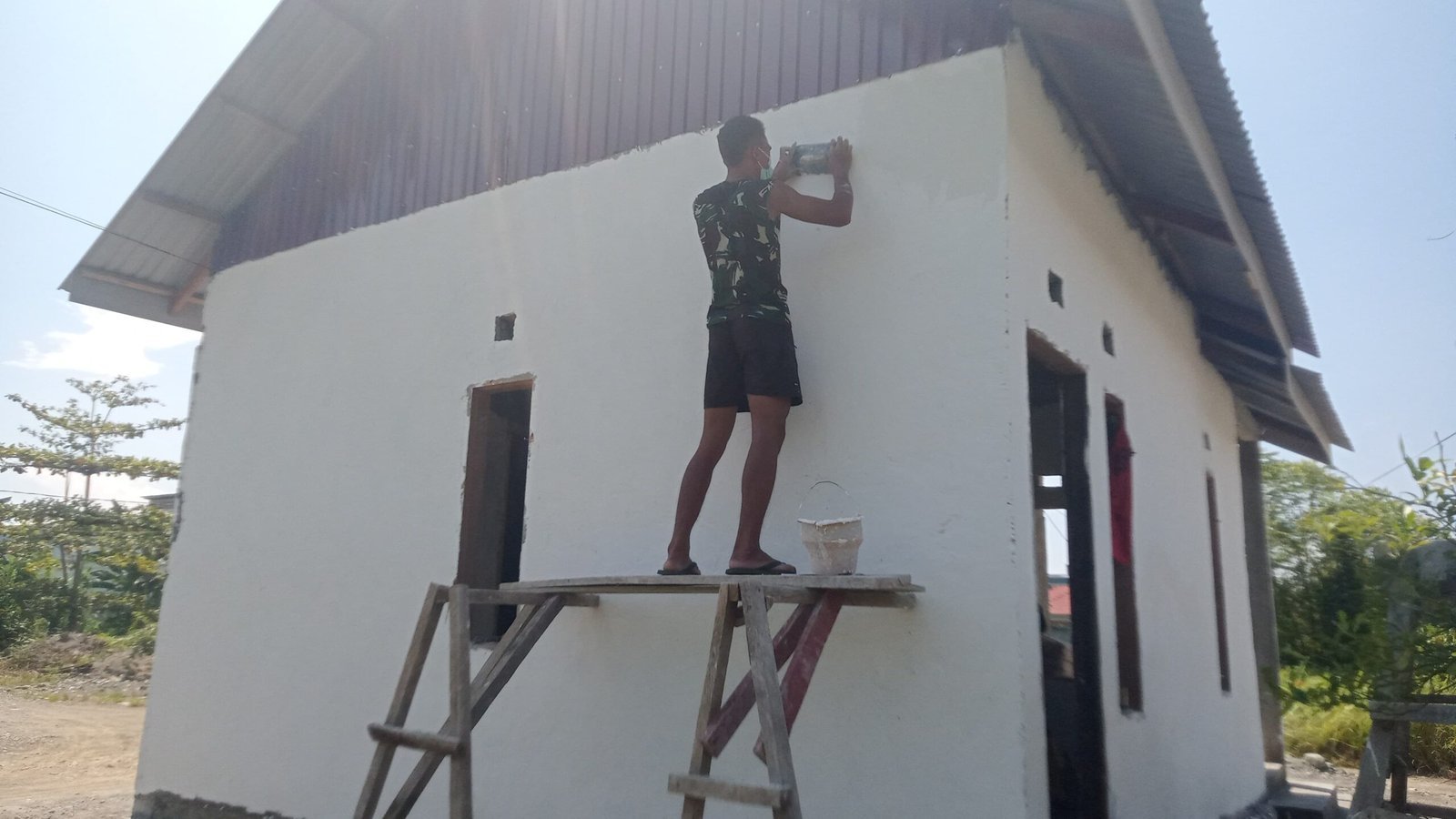 Anggota Satgas TMMD ke-123 Kodim 1311/Morowali tampak bahu-membahu menyelesaikan pekerjaan plamir dinding sebagai persiapan sebelum masuk ke tahap pengecatan. Proses ini dilakukan untuk memastikan hasil akhir dinding yang lebih rapi dan estetik.