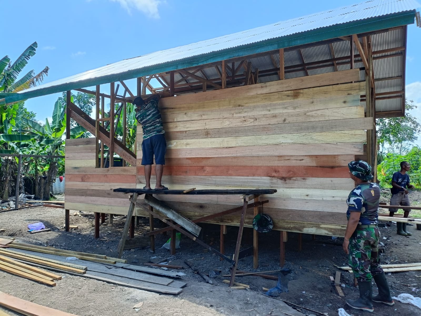 Tampak para prajurit TNI bersama warga bahu membahu di lapangan, mengerjakan bagian atap dan dinding rumah. Di bawah teriknya matahari, semangat gotong royong terus menyala demi segera terwujudnya hunian layak bagi Kai Salamun.