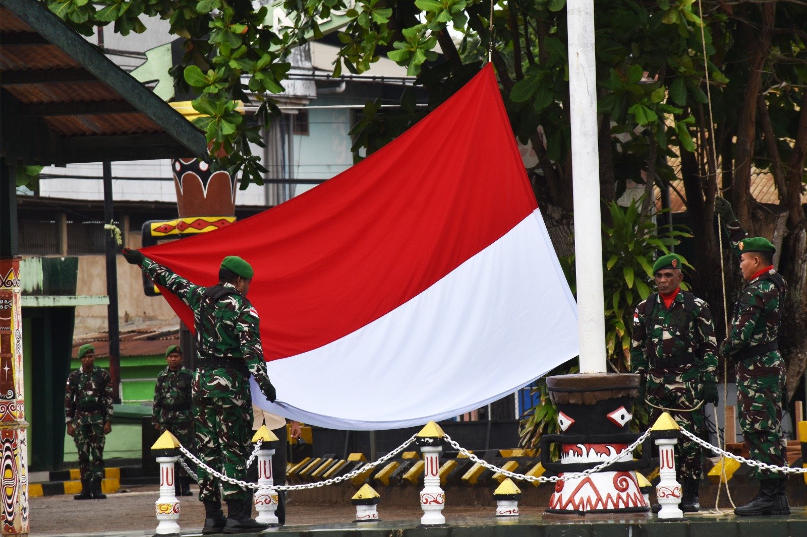 Pada kesempatan kali ini, bertindak sebagai Inspektur Upacara (Irup) yaitu Danramil 1707-02/Merauke, sementara Komandan Upacara (Danup) dijabat oleh Pasi Log Kodim 1707/Merauke Kapten Inf Trimo Widodo. Adapun Perwira Upacara (Paup) adalah Pasi Pers Kodim 1707/Merauke Kapten Inf Herman Purba.