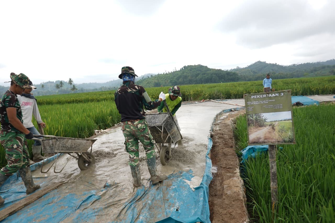 Di lokasi kegiatan, prajurit bersama warga tampak bahu-membahu mengangkut adukan semen menggunakan angkong menuju titik pengecoran. Campuran semen, pasir, dan split diratakan secara manual untuk memastikan permukaan beton padat dan tahan lama.