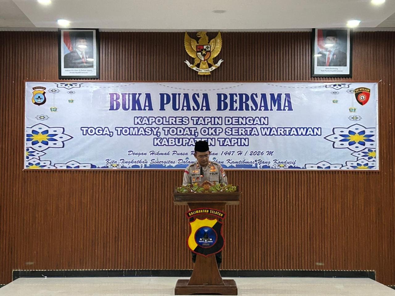 Wakapolres Tapin, Aunur Rozaq, dalam sambutannya menekankan pentingnya kolaborasi antara kepolisian dan seluruh unsur masyarakat. Ia menyampaikan bahwa Ramadan bukan hanya bulan ibadah, tetapi juga momentum mempererat komunikasi dan membangun kepercayaan publik.