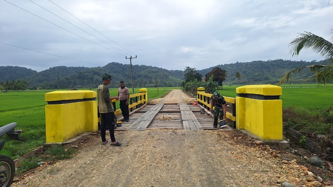 Tahap finishing yang dilakukan anggota Satgas TMMD berupa pengecatan jembatan yang sudah hampir rampung. di Kec. Asinua, Kab. Konawe, Senin (18/8).