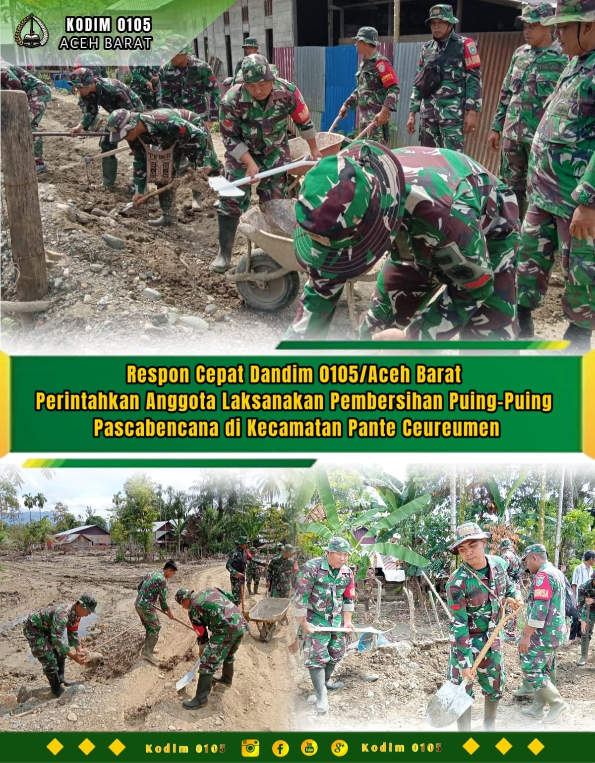 Dandim 0105/Aceh Barat, Letkol Inf S. Kembaren, S.E., M.I.P., CFrA., dengan cepat dan tegas memerintahkan seluruh jajaran serta personel teritorial untuk segera turun ke lapangan melaksanakan pembersihan puing-puing pascabencana.