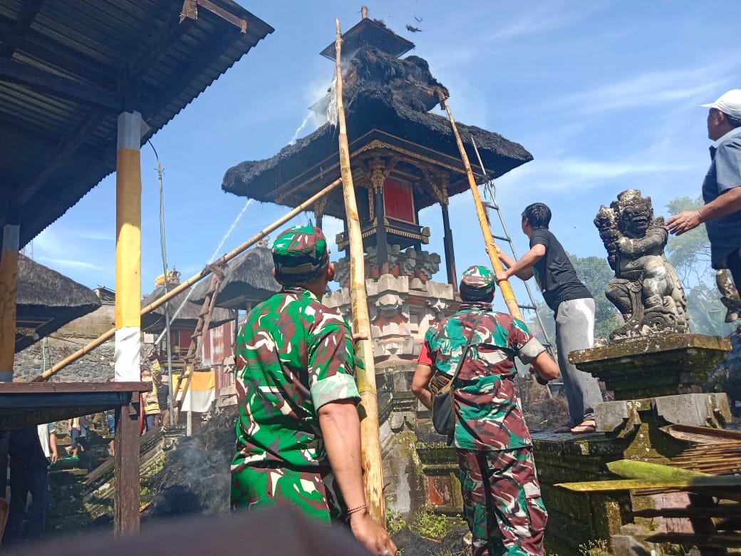 Bangli – Anggota Koramil 04/Kintamani Gerak Cepat Tangani Kebakaran pada pelinggih Meru tumpang tiga di Pura Puseh Desa Kintamani, Kecamatan Kintamani, Kabupaten Bangli, Jumat (2/1/2026)