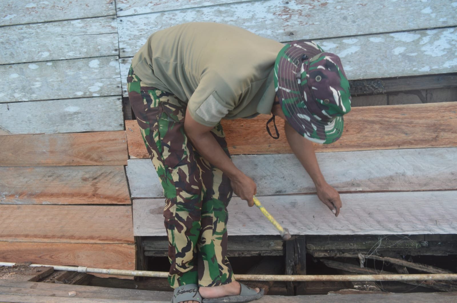 Sukamara – Personel Kodim 1014/Pbn yang tergabung dalam Satuan Tugas (Satgas) TNI Manunggal Membangun Desa (TMMD) ke-123 terus bekerja keras memastikan seluruh sasaran fisik rampung tepat waktu. Salah satu prioritas utama adalah percepatan Renovasi tiga unit Rumah Tidak Layak Huni (RTLH) yang tersebar di Desa Nibung dan Desa Sungai Damar, pembangunan RTLH telah memasuki tahap akhir, meliputi pemasangan pemasangan dinding papan dan pengecatan sebagai bagian dari proses finishing.