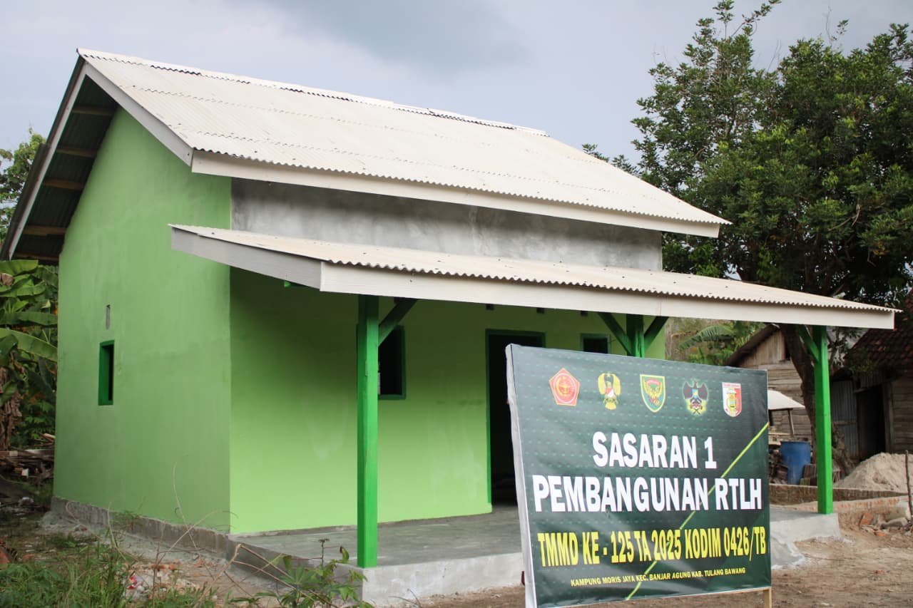 Tulang Bawang, 13 Agustus 2025 – Rehabilitasi Rumah Tidak Layak Huni (RTLH) sasaran 1 dalam program TMMD ke-125 Kodim 0426/Tulang Bawang di Kampung Moris Jaya, Kecamatan Banjar Agung, kini telah mencapai 95 persen. Pengerjaan meliputi pengecatan, perapian dinding, serta pemasangan plafon.
