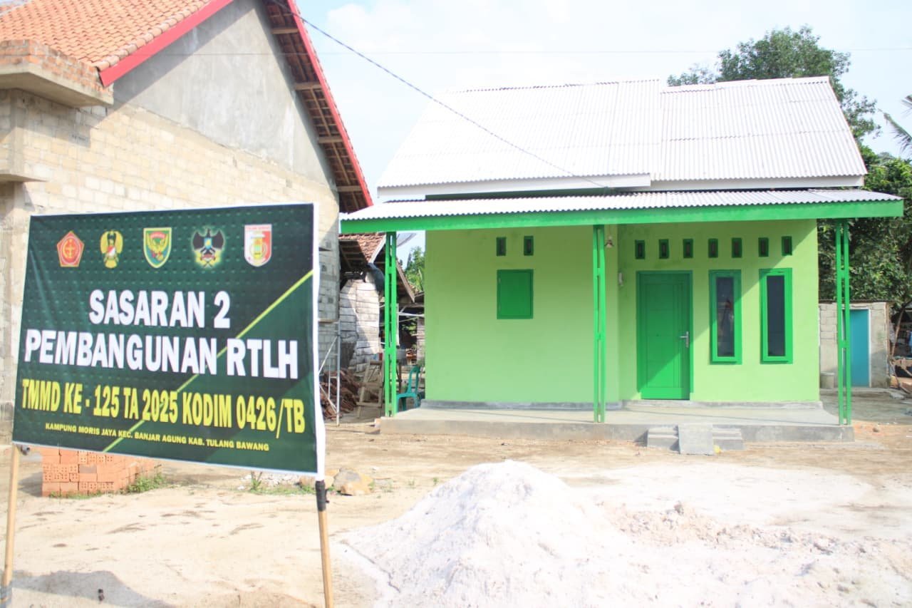 Tulang Bawang – Program TNI Manunggal Membangun Desa (TMMD) ke-125 Kodim 0426/Tulang Bawang kembali menorehkan hasil positif. Salah satu sasaran fisik berupa Rumah Tidak Layak Huni (RTLH) milik warga di Kampung Moris Jaya, Kecamatan Banjar Agung, kini rampung dikerjakan dengan capaian 100 persen, Sabtu (16/8/2025).