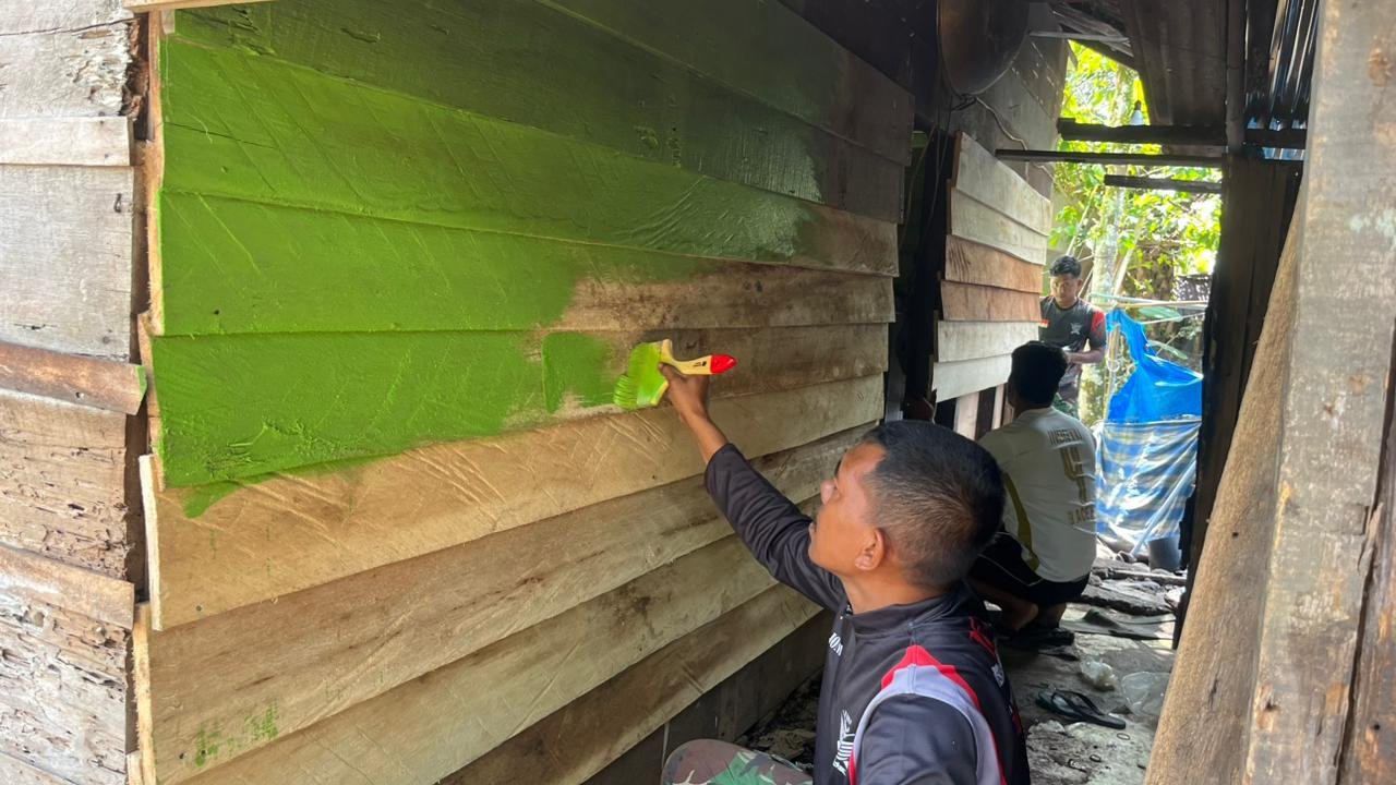 Kegiatan perehaban berlangsung Rabu (4/3/2026) dengan pembagian tugas yang rapi. Sebagian personel memperbaiki struktur dinding, sementara lainnya melakukan pengecatan. Warna hijau yang menghiasi rumah menjadi tanda kehadiran TNI yang membawa semangat baru.