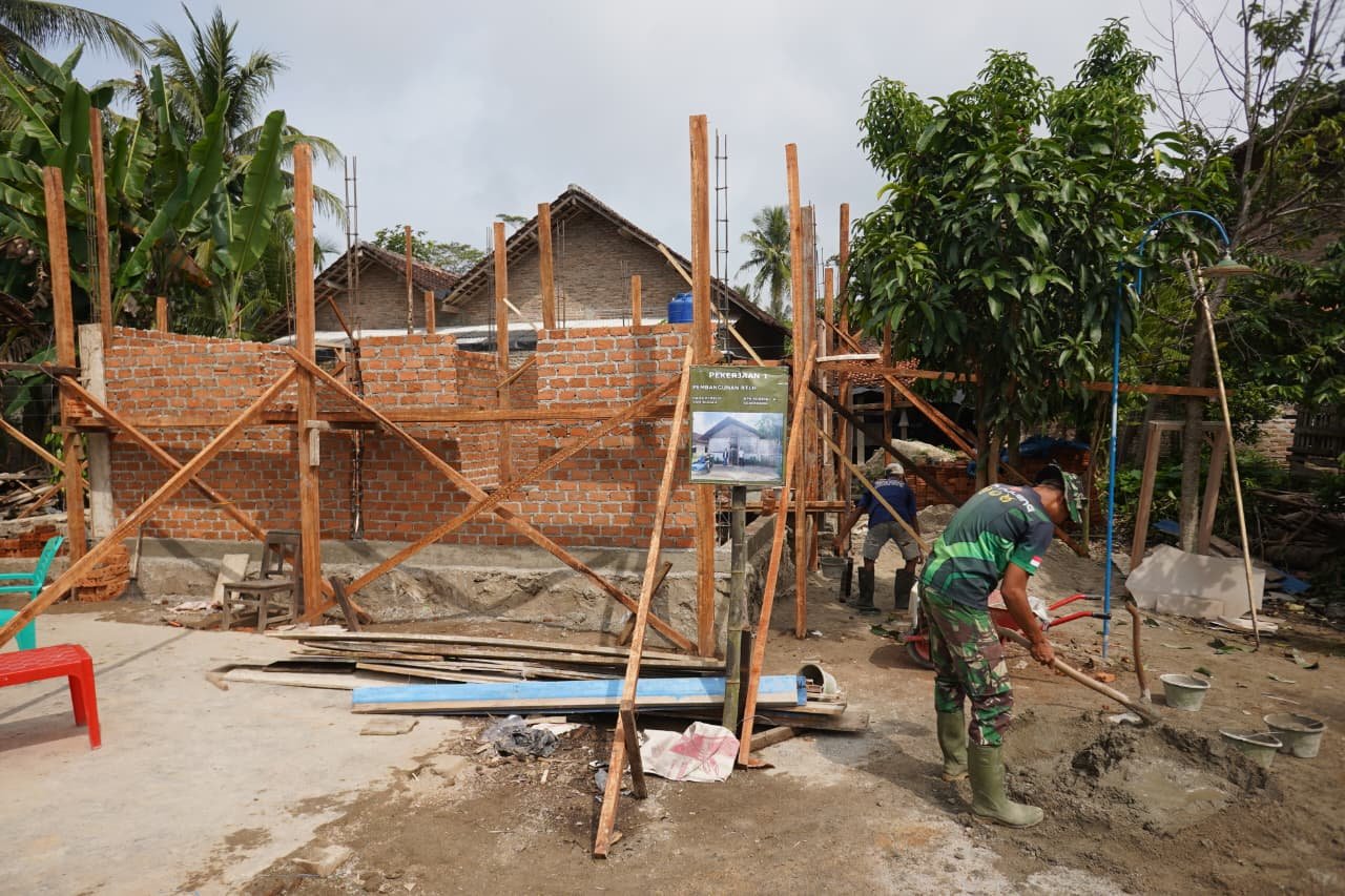 Personel Satgas TMMD bersama masyarakat setempat bergotong royong mengerjakan pembangunan dinding serta pemasangan kusen pintu dan jendela. Sinergi TNI dan warga terlihat solid demi mempercepat penyelesaian rumah agar segera layak ditempati.