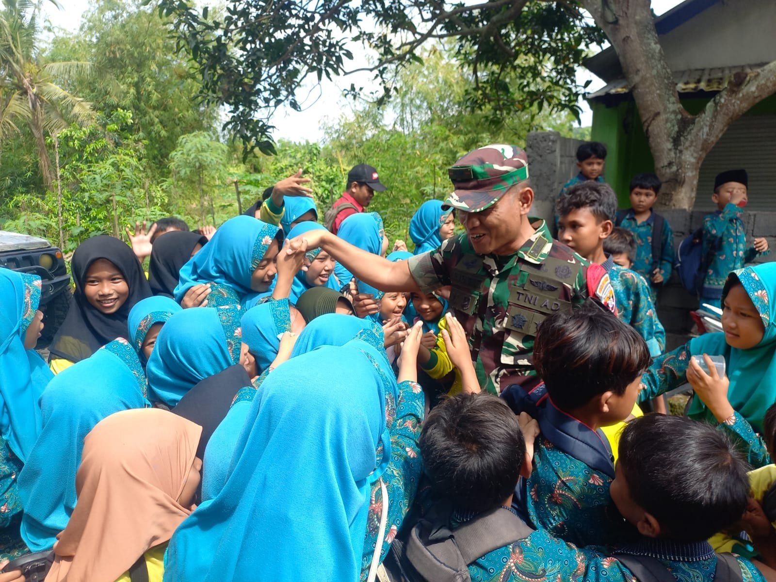 Kehadiran Dansatgas dan rombongan disambut antusias oleh warga, terutama anak-anak sekolah yang tampak gembira menyambut. Dengan senyum ceria dan ciuman tangan serta lambaian tangan, mereka mengiringi langkah Dansatgas menuju lokasi kegiatan.