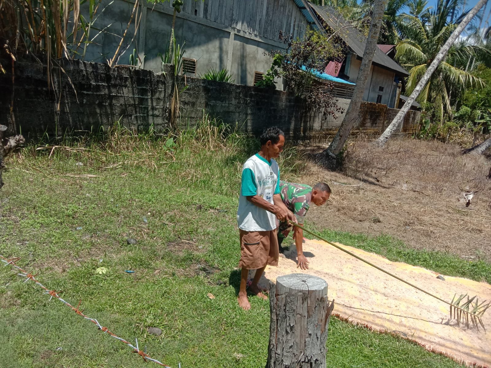 Aceh Jaya – Babinsa Koramil 0114-06/Teunom Serka Muhammad Daud membantu menjemur buah kelapa yang sudah di parut milik bapak Basri, untuk dijadikan kelapa gongseng sebagai bumbu makanan, bertempat di Desa Padang Kleng, Kecamatan Teunom, Kabupaten Aceh Jaya, Senin (17/3/2025).
