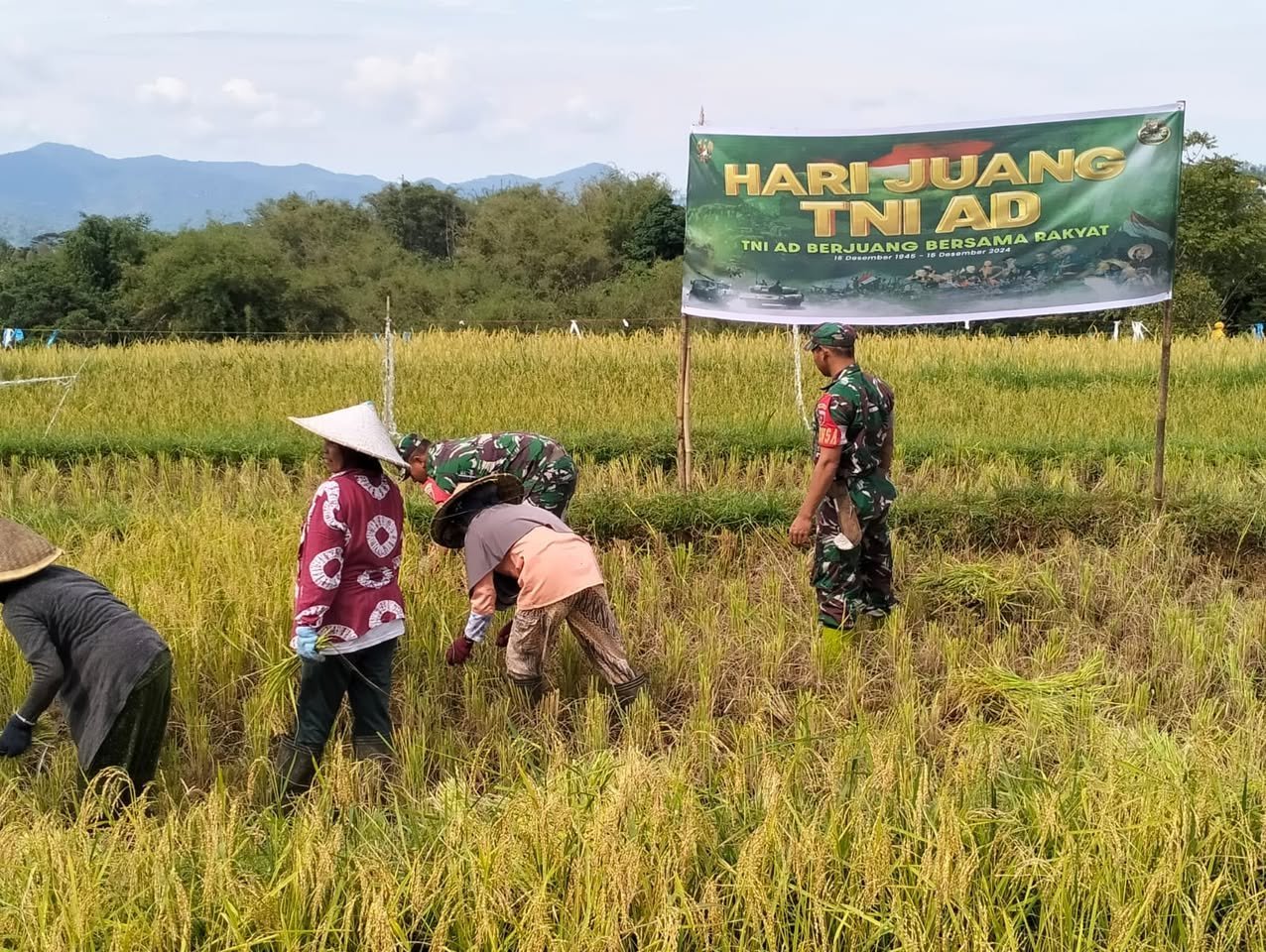 Gowa – Koramil 1409-04/Tinggimoncong melaksanakan panen raya padi dalam rangka memperingati Hari Juang TNI AD ke-79 untuk mendukung ketahanan pangan nasional tahun 2024. Panen raya padi ini dilaksanakan di lahan pertanian Kelompok Tani Sikapaccei di Lingk Parangbugis Kel.Buluttana Kec Tinggimoncong Kab. Gowa, Jumat (13/12/2024).