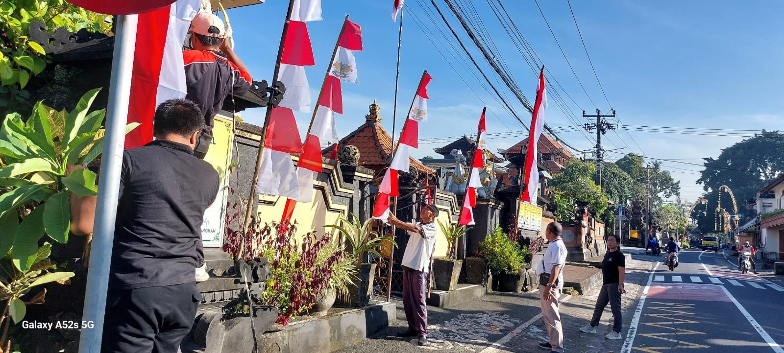 Tampak di lokasi, Babinsa Tohpati Kopda Komang beserta perangkat desa memasang umbul-umbul di sekitar area Kantor Desa Tohpati.