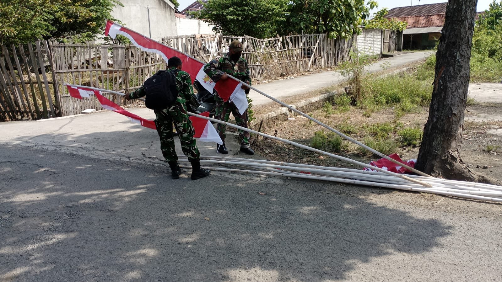 Riuh rendah suara warga yang saling bercengkerama dan bercanda memecah keheningan pagi. Terlihat tidak ada sekat antara warga sipil dan seragam loreng. Mereka bahu-membahu mengangkut tiang bendera, mengikat tali, hingga memastikan setiap tiang berdiri tegak.