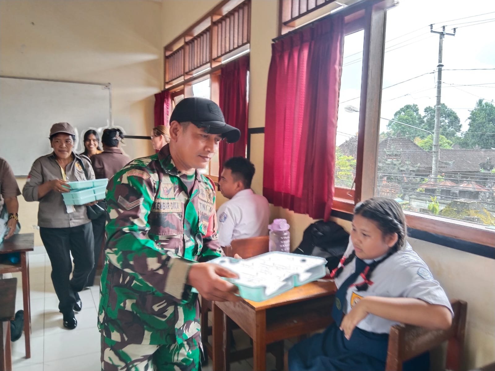 Disela pendampingannya, Kapten Cba I Nyoman Suryatha menyampaikan bahwa hari ini program MBG ( Makan Gizi Gratis ) resmi dilaksanakan di Klungkung dengan menyasar pelajar tingkat TK, SD dan SMP di 3 wilayah yaitu Desa Tegak, Desa Selat dan Desa Selisihan dengan jumlah pelajar 968 orang.