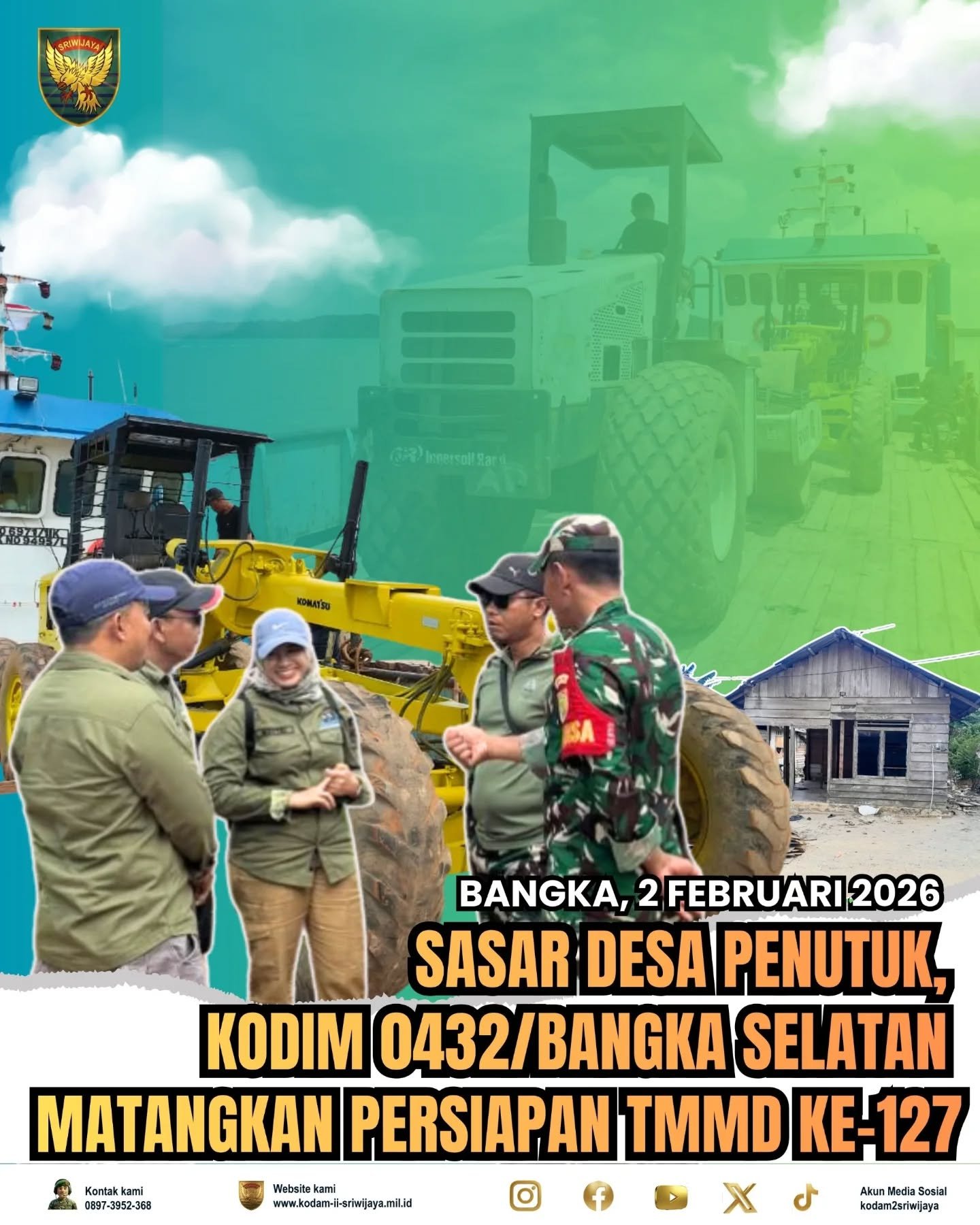 ”Kami ingin memastikan seluruh sarana pendukung dan alat berat sudah stand-by di lokasi sebelum pembukaan. Selain pembangunan fisik, Fokus TMMD juga bagaimana kehadiran TNI benar-benar dirasakan manfaatnya untuk peningkatan kesejahteraan dan kualitas hidup masyarakat di Desa Penutuk,” ujar Dandim 0432/Bangka Selatan, Letkol Inf Agus Wicaksono.