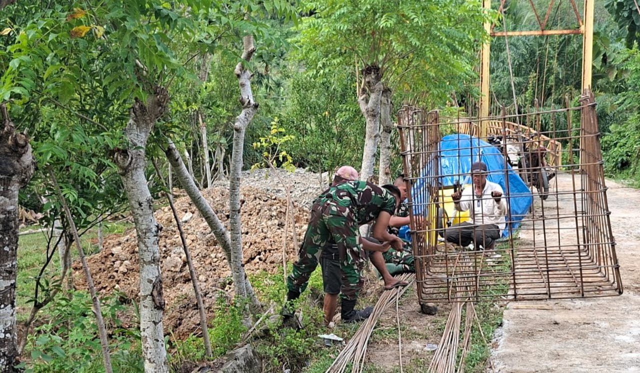 Danramil 408-03/KT Kapten Inf Agus Gunadi, menyampaikan bahwa proses perakitan besi cakar ayam pondasi jembatan merupakan tahapan krusial dalam pembangunan jembatan.