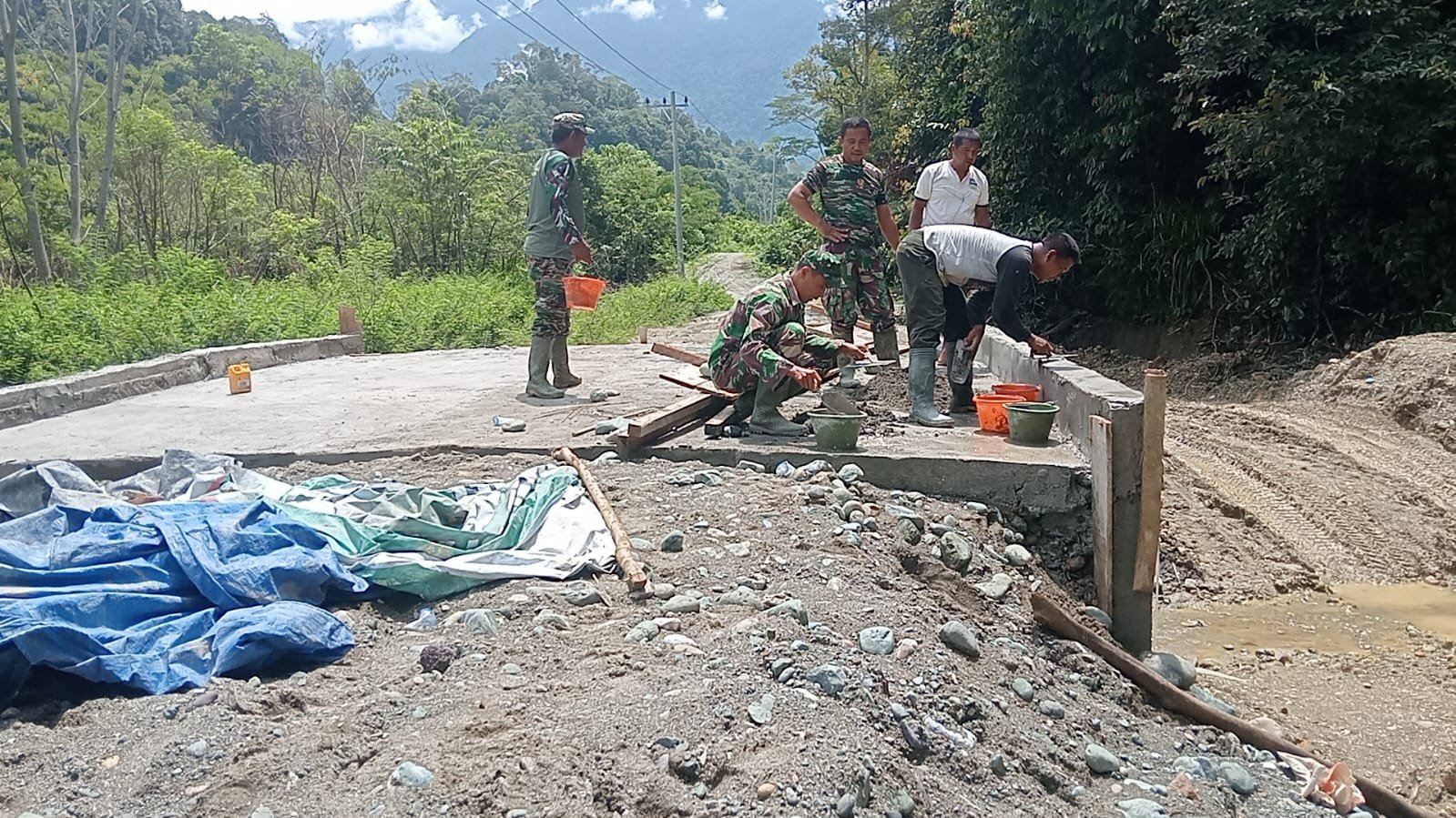 Sejak pagi hari, personel TNI bersama warga bahu-membahu mengaduk material berupa sirtu dan semen dengan komposisi yang telah ditentukan guna menghasilkan cor beton yang berkualitas. Proses pengerjaan dilakukan secara manual dengan penuh ketelitian agar setiap bagian lantai jembatan memiliki kekuatan yang maksimal.