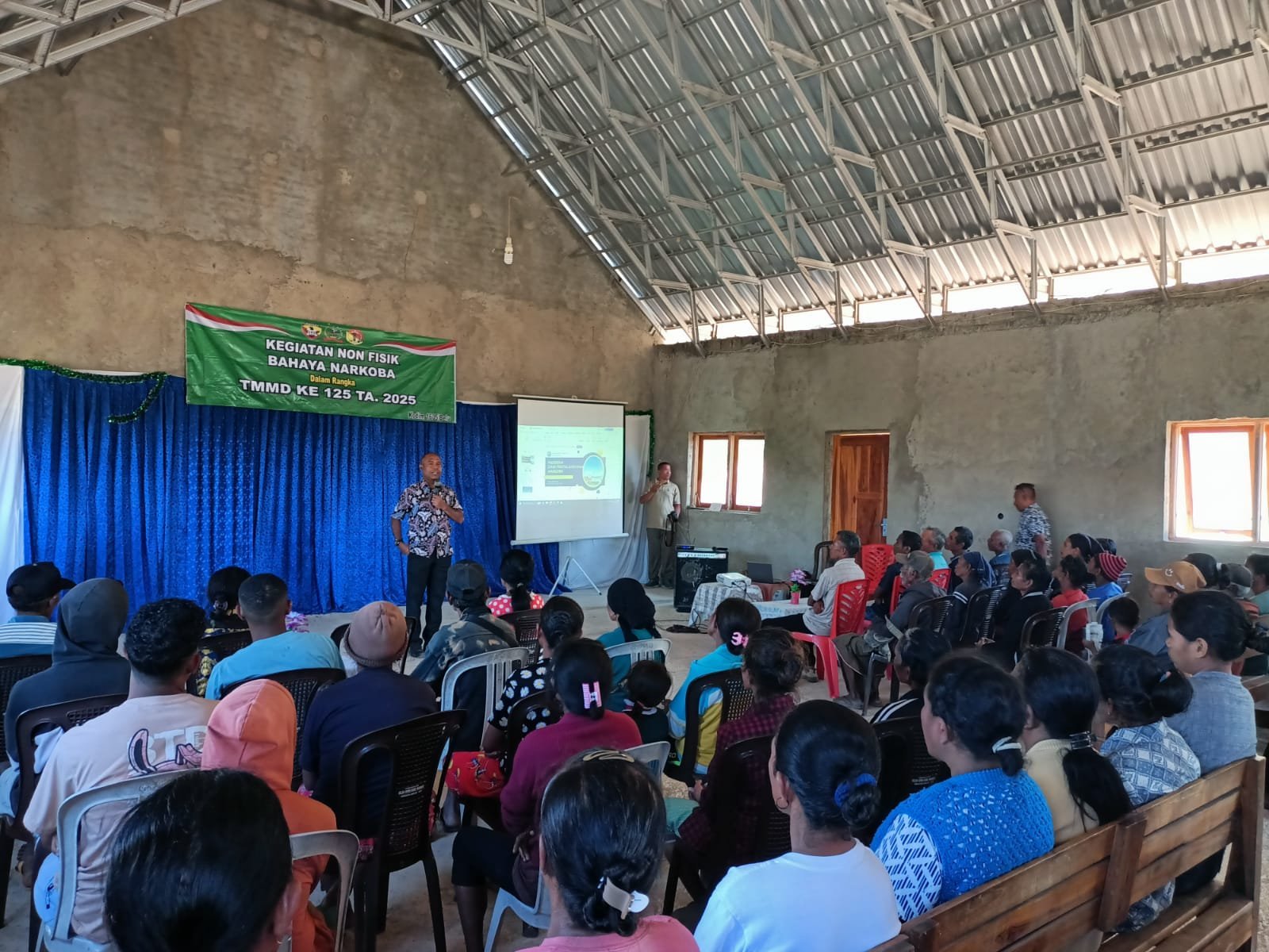Belu, 16 Agustus 2025 – Satgas TMMD ke-125 Kodim 1605/Belu bersama BNN Kabupaten Belu menggelar penyuluhan pencegahan penyalahgunaan narkoba di Gedung Gereja GBI Maranatha Dusun Mauulun, Desa Naekasa.
