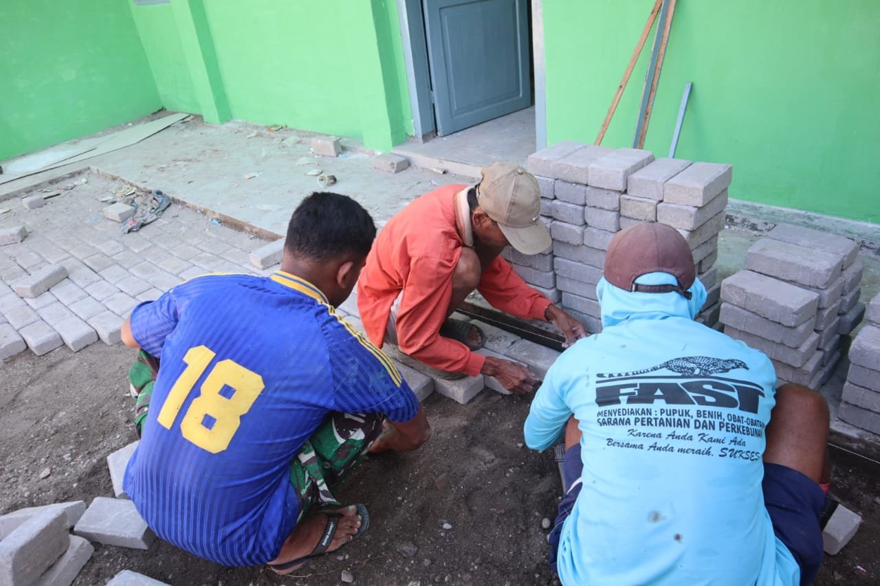 Proses pengerjaan dilakukan secara bersama-sama, mulai dari menata material, menyusun paving blok, hingga merapikan halaman. Suasana kebersamaan antara prajurit TNI dan warga terasa begitu kental, mencerminkan kemanunggalan TNI dengan rakyat yang selalu menjadi ruh dari pelaksanaan TMMD.