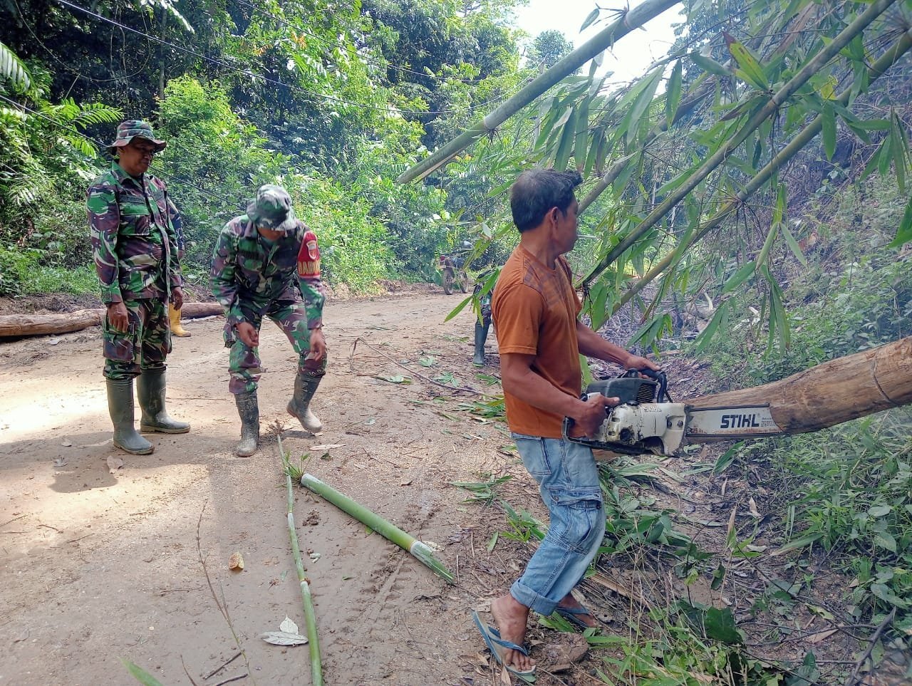 Kejadian tersebut sempat menghambat aktivitas warga dan mengganggu kelancaran akses menuju lokasi sasaran TMMD. Tanpa menunggu lama, anggota Satgas bersama masyarakat segera melakukan evakuasi pohon tumbang menggunakan alat sederhana seperti parang, gergaji mesin, dan tali.