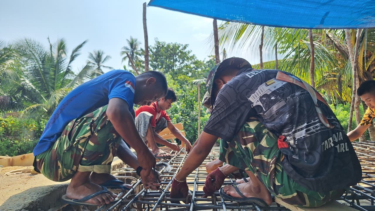 Personel TNI dan masyarakat tampak kompak merangkai struktur besi dengan penuh ketelitian. Setiap sambungan diikat dan disusun sesuai ukuran teknis agar konstruksi jembatan memiliki daya tahan yang kuat.