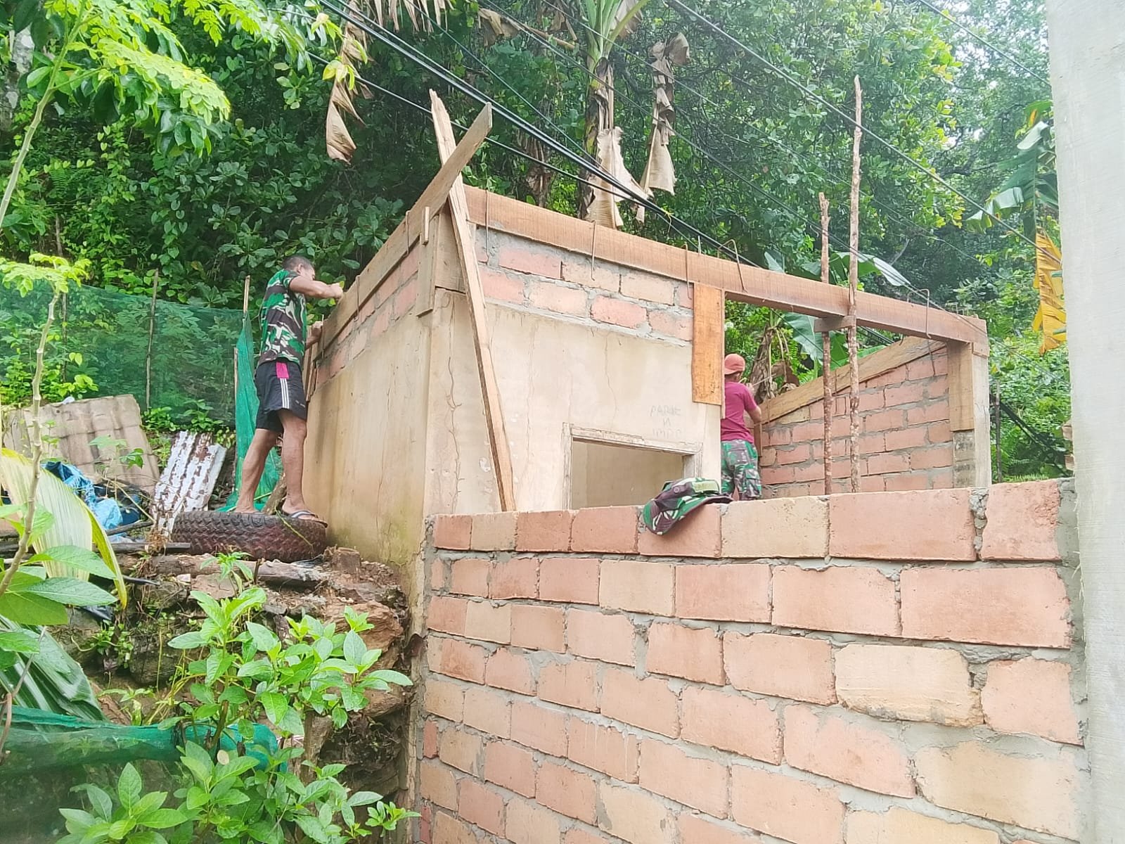 Anggota dari Kodim 1417/Kendari bersama warga terlihat bahu-membahu menyiapkan adukan beton dan menuangkannya ke bagian struktur atas bangunan.