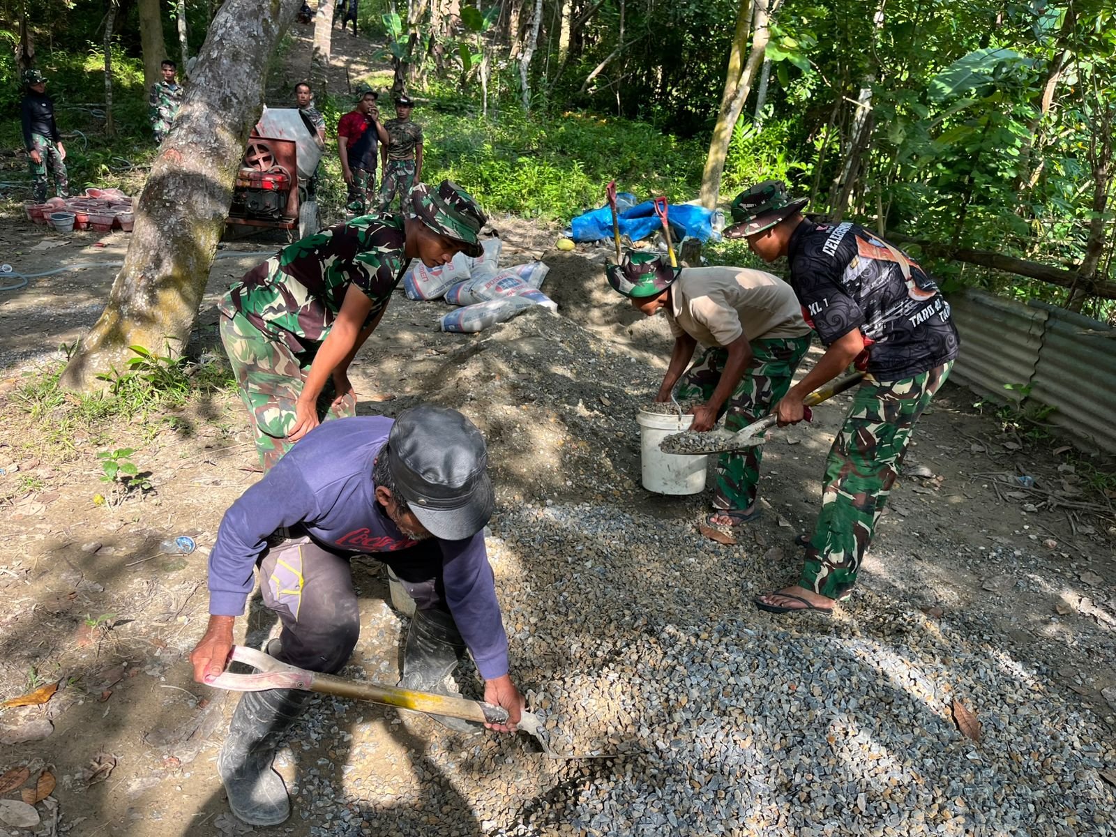 Meski dihadapkan pada tantangan geografis, semangat gotong royong tidak pernah surut. Para personel tetap kompak mengangkut semen, pasir, dan air demi memastikan proses pengecoran berjalan sesuai rencana.