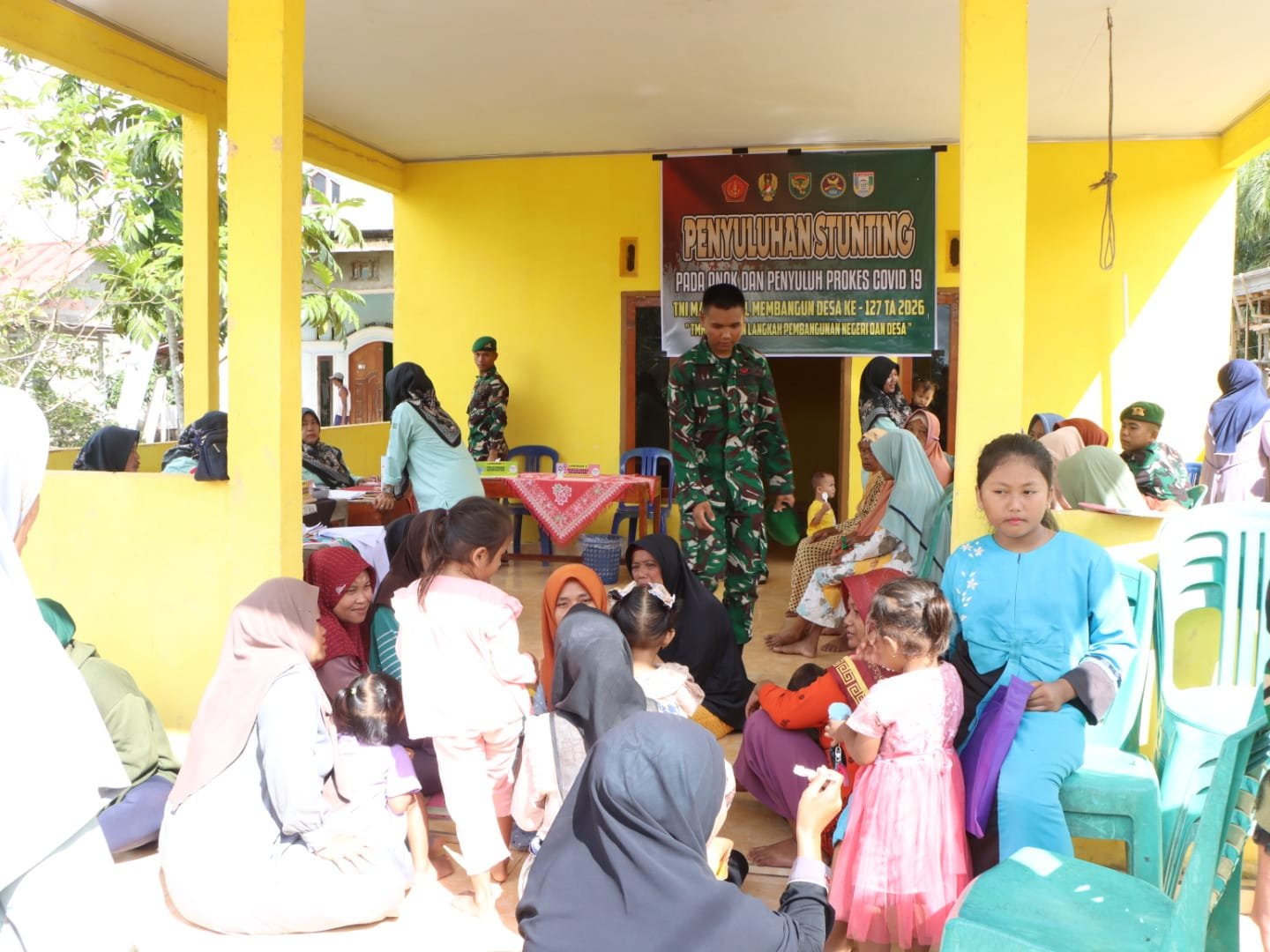 Banyuasin – Anggota Satgas TMMD 127 dari Kodim 0430/BA melaksanakan kegiatan penyuluhan stunting pada anak serta penyuluhan protokol kesehatan (Prokes) Covid-19 kepada masyarakat di Desa Wonosari, Kecamatan Pulau Rimau, Kabupaten Banyuasin.