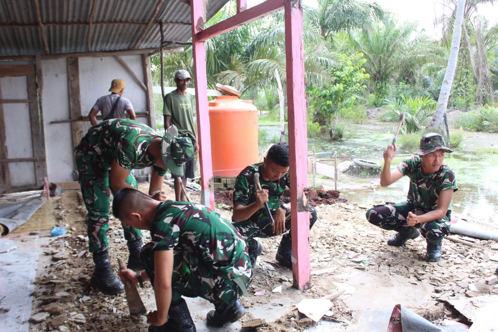 Banyuasin – Personel Satgas TMMD Ke-127 dari Kodim 0430/BA memulai pembongkaran Rumah Tidak Layak Huni (RTLH) milik Ibu Suharti yang berada di Jalur 2 Dusun 1, Desa Wonosari, Kecamatan Pulau Rimau, Kabupaten Banyuasin, pada 21/02/2026.