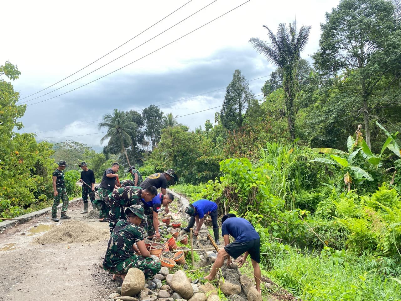 Dalam pelaksanaannya, personel Satgas bersama masyarakat melakukan penghamparan material, perataan badan jalan, serta pemadatan guna memastikan kualitas hasil pekerjaan tetap optimal. Sementara itu, pembangunan talud terus dikerjakan untuk menjaga kestabilan tanah di sepanjang sisi jalan.